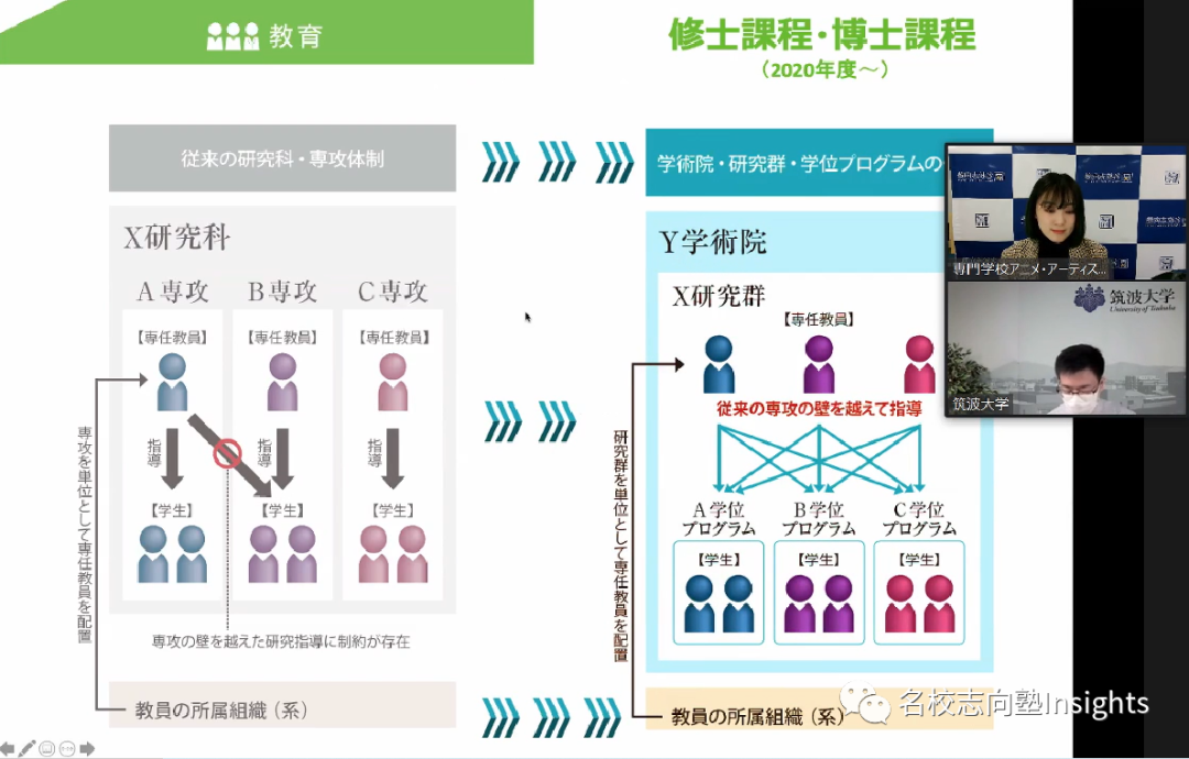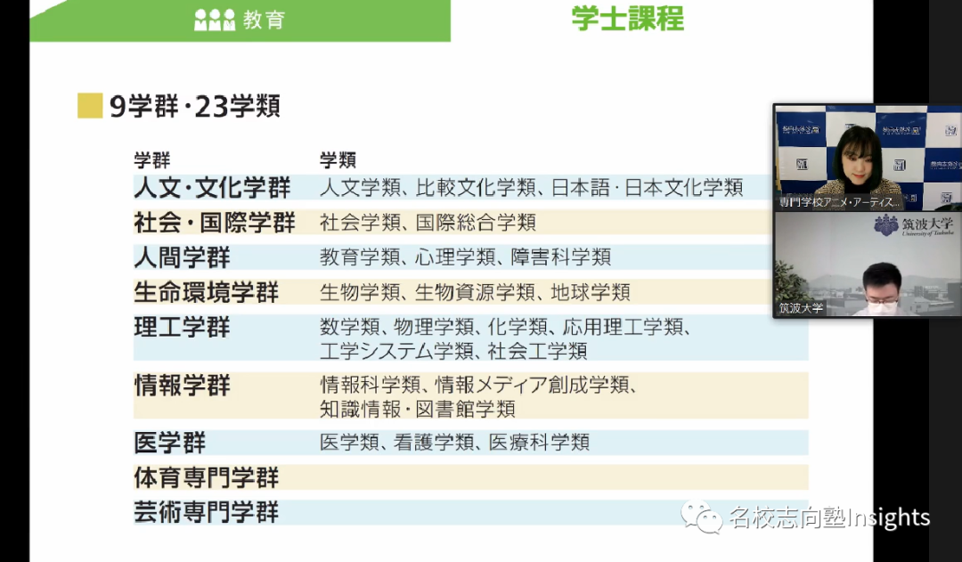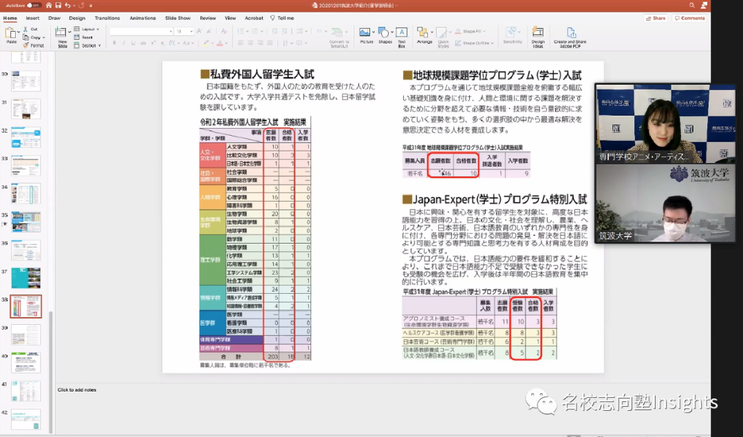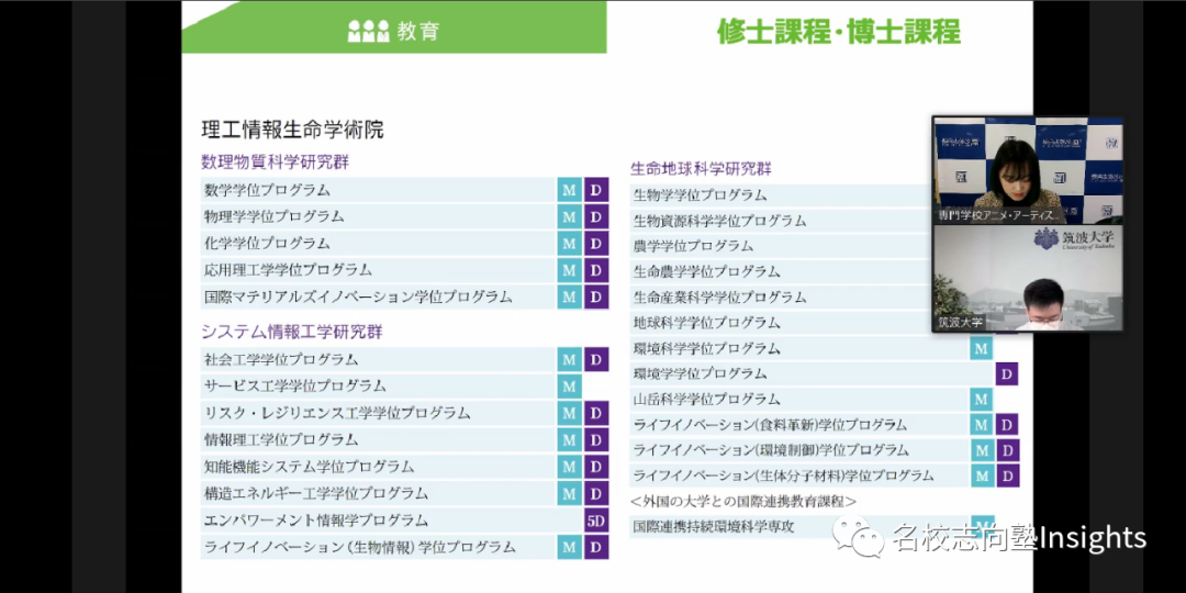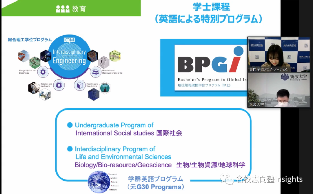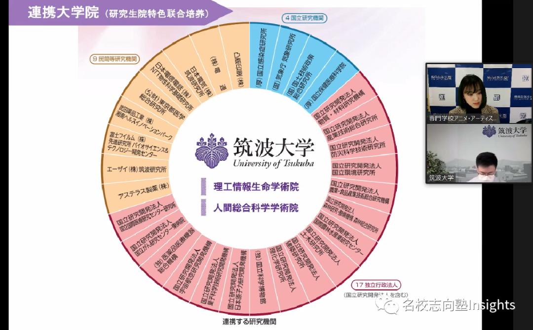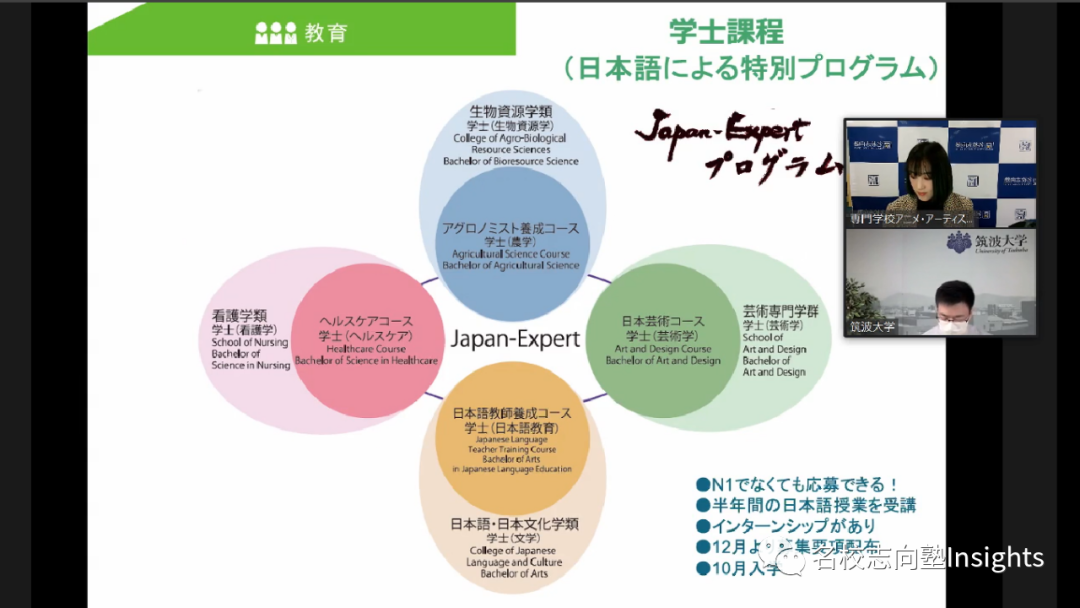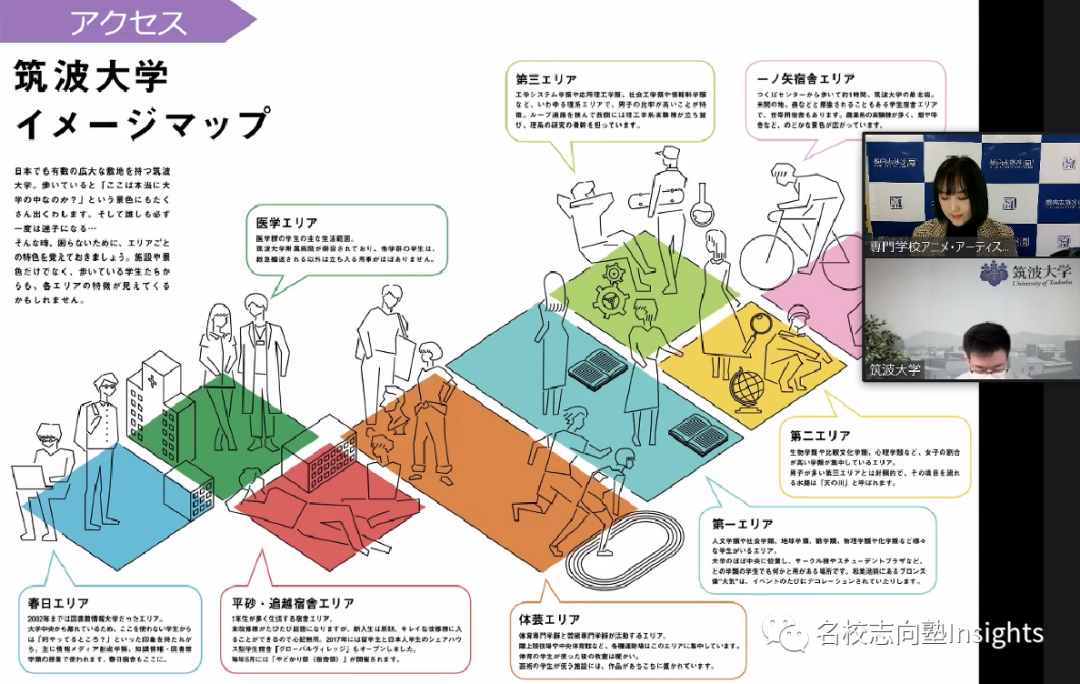 本次我们邀请到筑波大学入试科的老师为大家介绍大学的概况,包含校区介绍、学生生活支援、学部大学院课程中所设置的英文日文项目一览及各自优势等。筑波大学的老师同时也根据各类项目的特点分析了适合报考的考生群体,为考生提供了报考方向,帮助考生了解了项目的入试概况,并在答疑环节中一一解答了同学们的疑问。