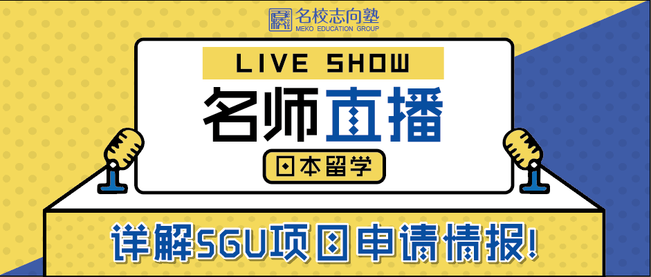 5月10日名校志向塾SGU申请团队---日本SGU项目申请指导线上直播分享会!本次由名校志向塾开展的线上宣讲活动将为大家诚意详解各类TOP名校,如东京大学、早稻田大学、庆应义塾大学、上智大学等日本顶级国立、私立名校所开设的高含金量SGU学部项目内容及相关申请步骤。