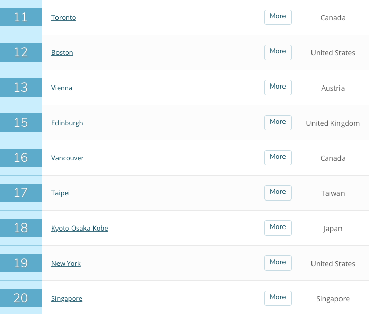 除了大家津津乐道的世界大学排名外,QS机构还统计过许多权威的小众排名。接下来笔者想介绍的,就是QS Best Student Cities——最佳学生城市排名。