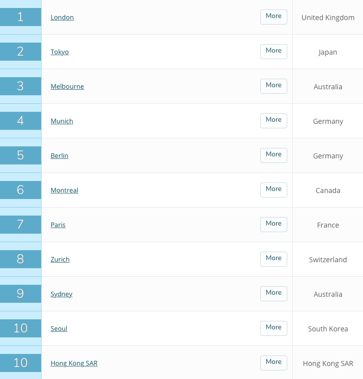 此外,在Affordability一项上,日本城市也普遍成绩优异。这一点相信不必笔者多说,日本一向是工薪家庭与中产家庭出国留学的热门选择。在极其有限的资金里,留学日本能让我们拥有选择更好未来的权力。