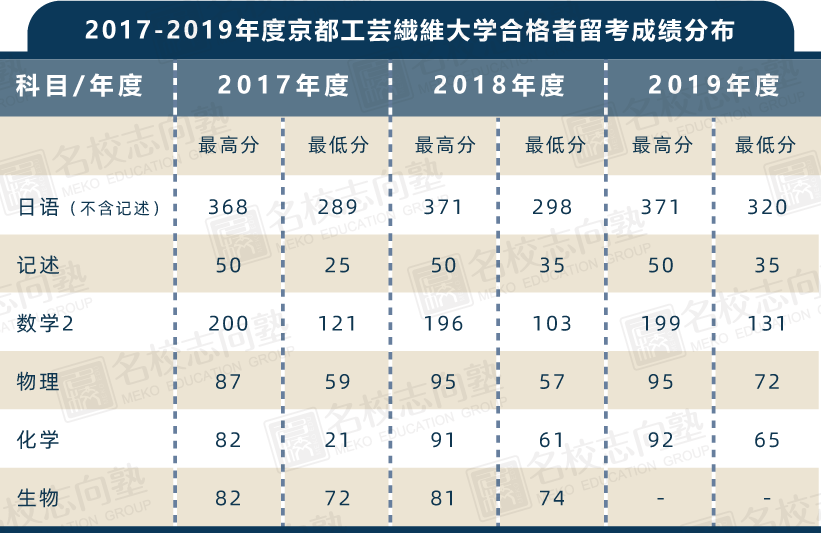 从所有志望者都需要提交的日语成绩来看,京工纤对于考生的日语最低分要求逐渐上升。而数学2虽在18年度面临了些许波动,但19年度最低分已比17年度高出10分。而物理、生物、化学科目的成绩要求同样呈逐年上升趋势,对考生要求逐渐增高的大趋势显而易见。观察数据,生物的最高分均出现在应用生物学课程的志望者中,且纵观全课程,物化生成绩中只有生物成绩最高分最低分之间的差值最小,由此可见京工纤对于使用生物成绩出愿的考生筛选最为严格。