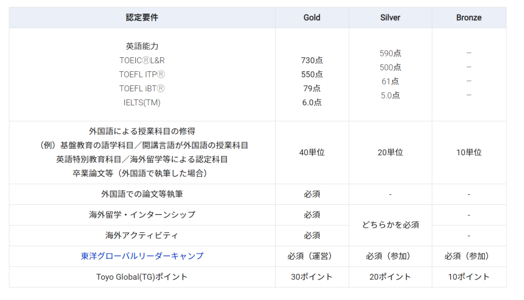 各位看看这几个青铜/白银/黄金的段位(GOLD、SILVER、BRONZEステージ),小编甚至怀疑国际部的老师怕不是游戏玩多了(失礼了)。所以如何成为东洋TGL项目终极王者(指传说中的TOYO Leader)呢?小编先去看看攻略本(指TGLプログラム的パンフレット)。简单来说,TGL并不是常见的精英项目,而是入学时全员默认参加,似乎也没有“刷不到什么段位就不能毕业”这种说法,全凭学生自愿。日常的语学课程、英文授课科目、外语论文撰写都可以转化为“升级”的经验值,海外留学、海外实习能够加速等级提升,而在此基础上若能成功“斩杀”托福、雅思、托业等boss,可能能得到全服范围内(指毕业式或认定式)横幅公示表彰(?),并且获得黄金水杯(GOLDボトル)或白银徽章(SILVERバッジ)。上述内容并非本人信口开河,都是官方信息,各位请看↓↓↓