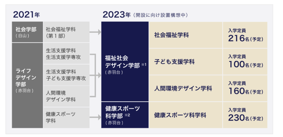 据官方所述,选择在赤羽台建校区,是为与东京都23区中高龄化最严重的北区连携,向着地域社会的课题解决和发展共同努力。关于学部再编,大学方面似乎还在商讨中。目前的想法是将社会学部与ライフデザイン学部再编成为福祉社会デザイン学部和健康スポーツ科学部,以实现从福祉和运动健康的角度解决高龄化和健康问题。*学部再编示意图
