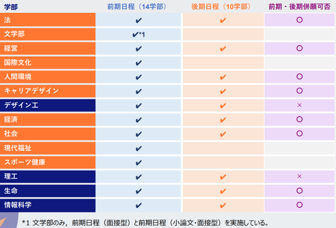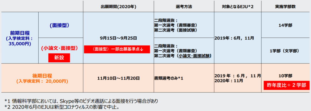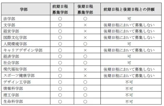 参照往年要项,前期日程中,出愿基准点下调学部有:法学部法律学科和经营学部(日语270点→250点)、人间环境学部和キャリアデザイン学部(由日语280点分别调至270点和265点)、理工学部和生命科学部(日语280点→260点)、情报科学部(日语280点→270点)。
