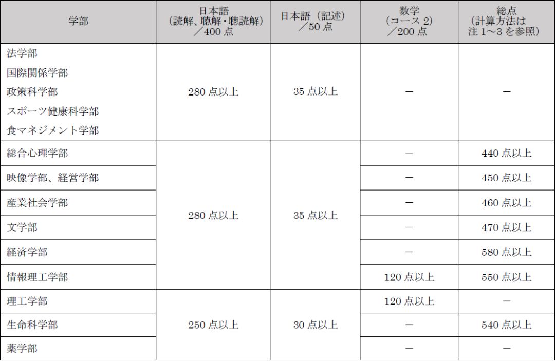 法学部 、産業社会学部、国際関係学部、文学部、映像学部、政策科学部、総合心理学部、経済学部、スポーツ健康科学部、食マネジメント学部: 留考日语280点以上且记述35点以上