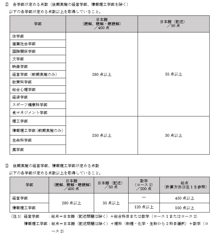 -情報理工学部:前期要求日语250点以上且记述30点以上;后期要求留考日语280点以上且记述35点以上,同时理系数学120点以上且“日语(不含记述)+数学2+理科(3选2)”总分550点以上
