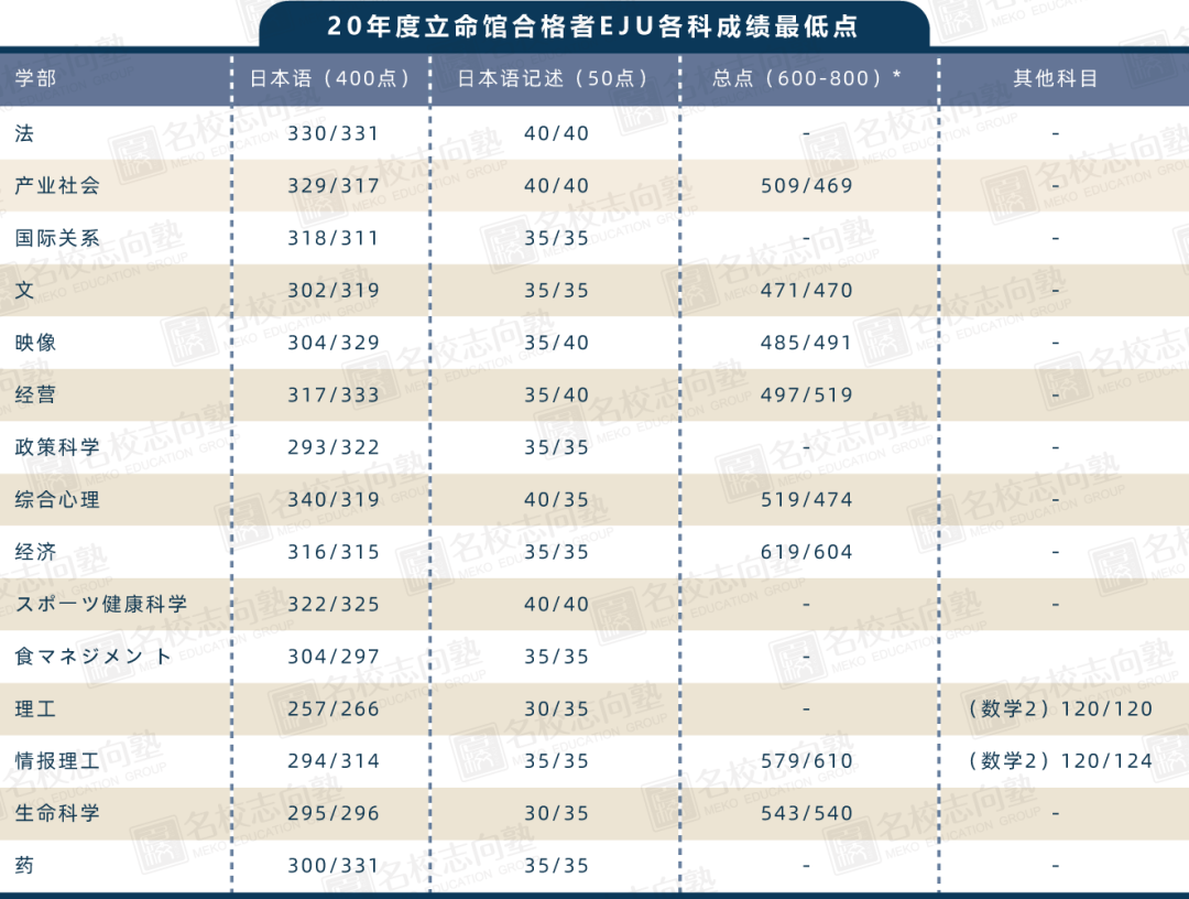 相比文系学部,理系学部对日语要求较低。而记述似乎不怎么被看重,只需达到基准点即可。对比前后两期日语的合格最低点可以发现,法学部、经济学部、理工学部、生命科学部、国际关系学部、产业社会学部的成绩浮动不大,相对比较稳定,各位可根据自己的日语成绩与其进行对比参考来决定是否出愿。