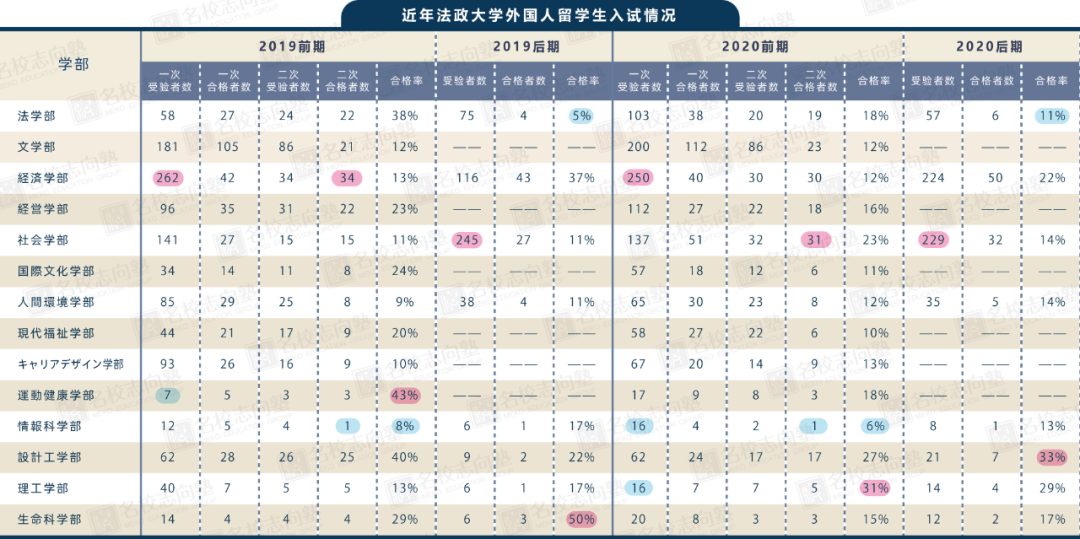 不过,总体而言法政还是更看重书面成绩。我们可以看到,比起二次试验(校内考),一次试验(书类审查)明显筛掉了更多考生。尤其从标红的几个结果来看,这些学部在二次试验几乎没有筛掉考生,可见无论选择前后期哪种形式,书面成绩总是法政考察学生的核心要义。
