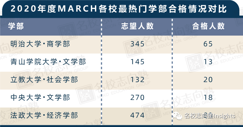 根据2020年度所公布的数据来看,各校在留学生群体中报考人数最多的学部分别是明治大学商学部、青山学院大学文学部、法政大学经济学部、中央大学文学部、立教大学社会学部。可以看到,文学系学部险胜经济系,一跃成为留学生们心目中的新贵。