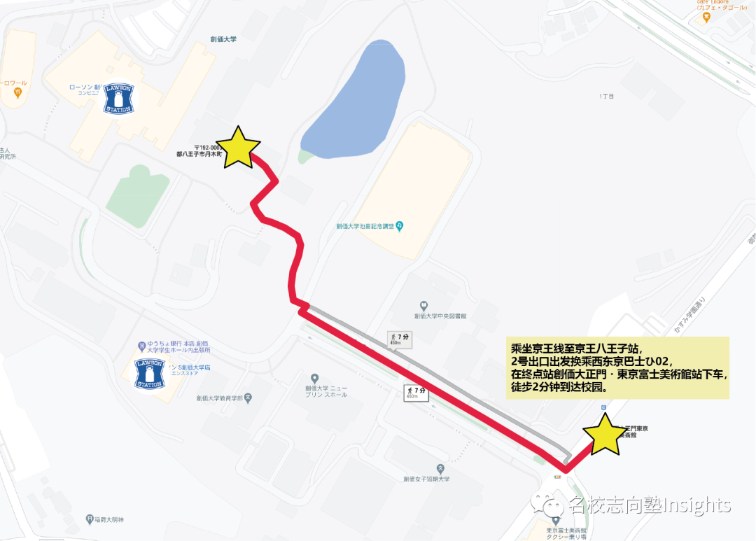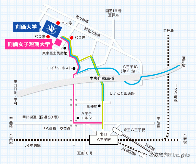 乘坐京王线至「京王八王子」站,2号出口出发换乘西东京巴士ひ02,在终点站「創価大正門・東京富士美術館」站下车,徒步2分钟到达校园。