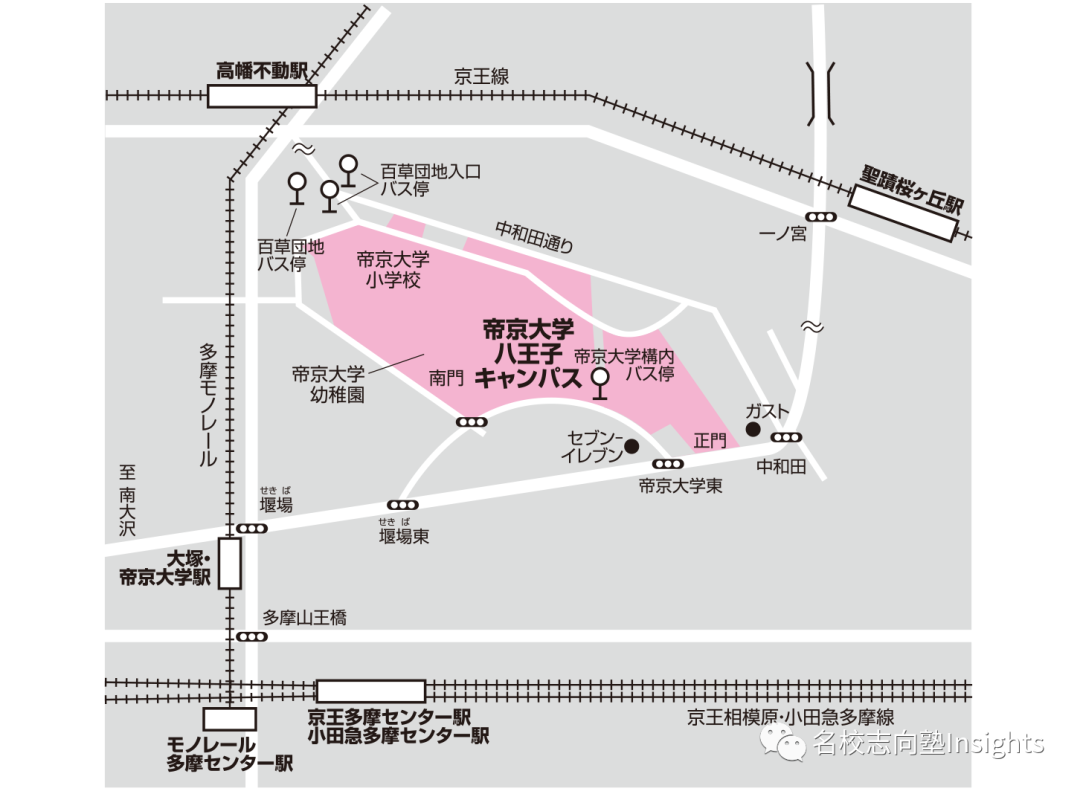 ②乘坐京王线至「聖蹟桜ヶ丘」站,在巴士2号站台换乘京王巴士,在终点站「帝京大学構内」下车,直达校园