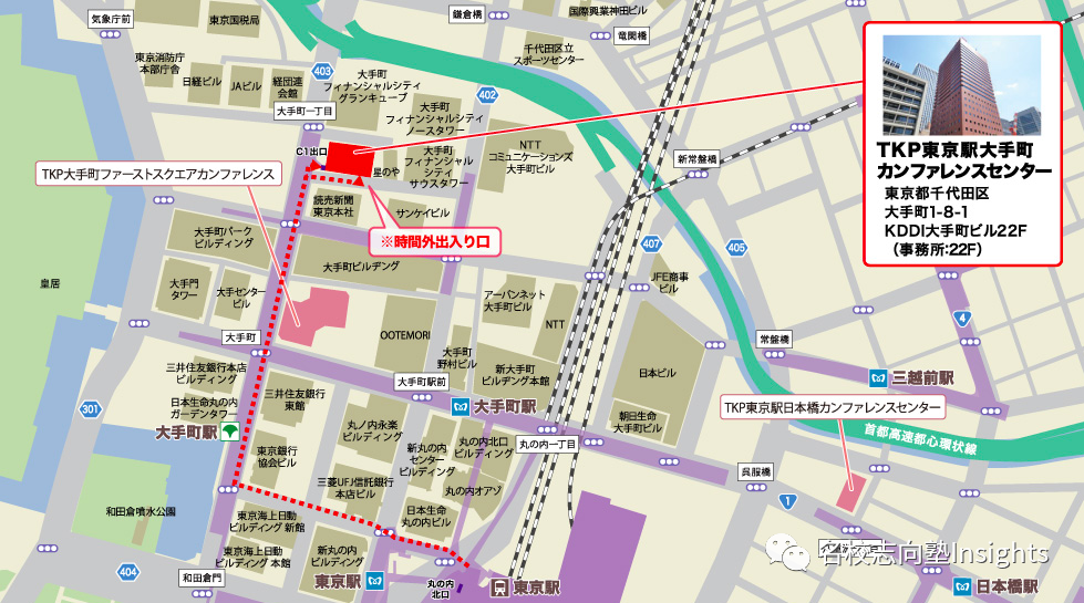 ①东京metro千代田线/半藏门线/东西线/丸之内线「大手町」站,C1出口直达