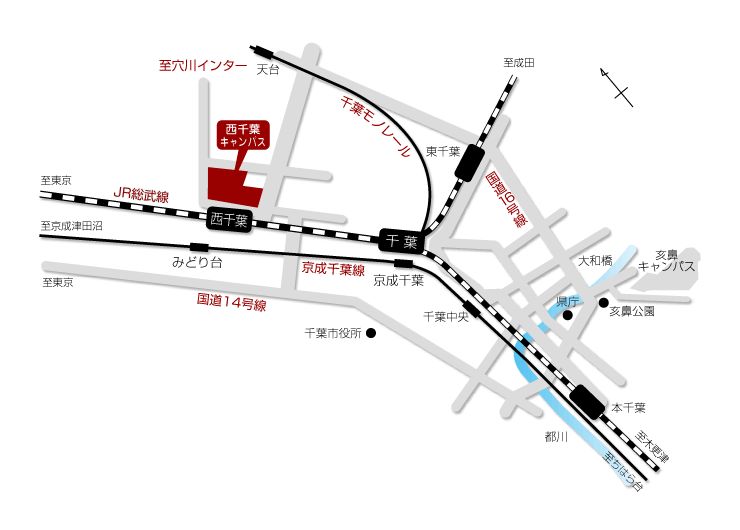 在JR西千葉下车 走北口徒步约8分钟到达西千葉キャンパス正门,徒步约4分钟到达考试会场