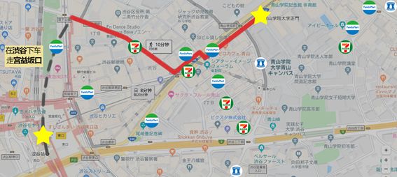 在JR山手線・埼京線・京王井の頭線・東急東横線・東急田園都市線・東京メトロ副都心線他「渋谷」下车,走宮益坂方面出口 徒步10分到达大学正门