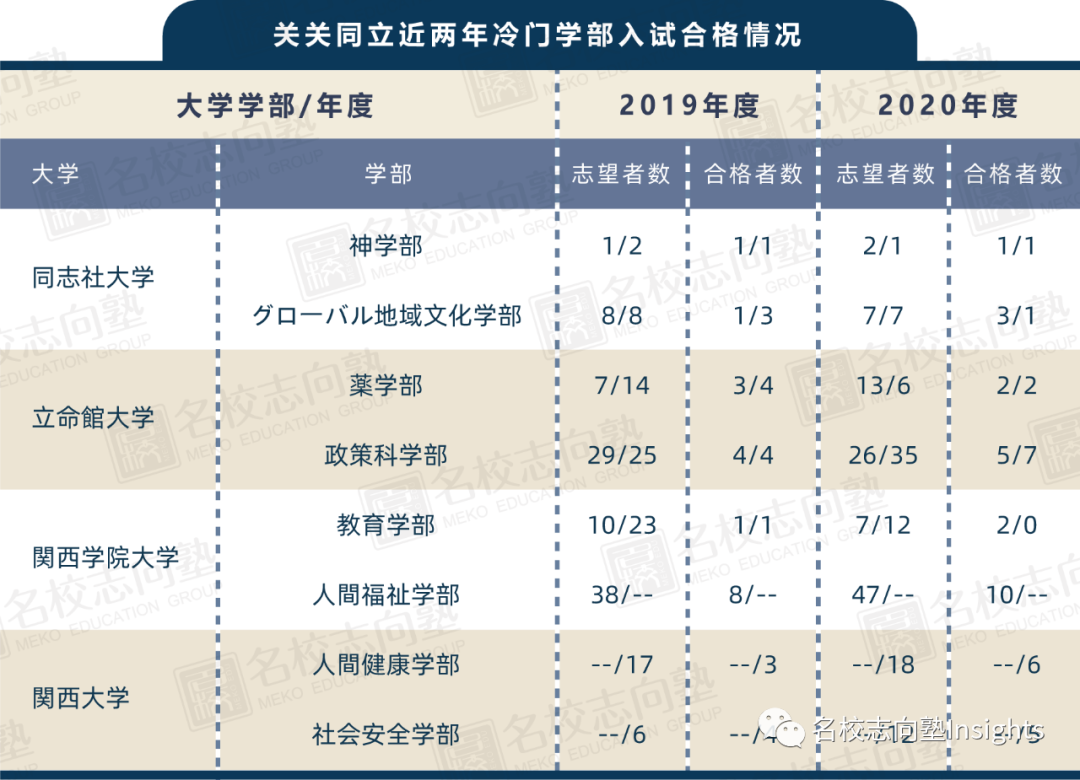 尽管截止至2020年度,关关同立四校均设有前后两期入试,但其中,同志社和立命馆为前后两期全学部均可报考;而关学和关大则是前后两期报考学部各有不同。然而,不论哪种情况,上表中的几个学部的合格情况都可以说是几近苛刻,前后两期加起来都很少有超过两位数的情况。