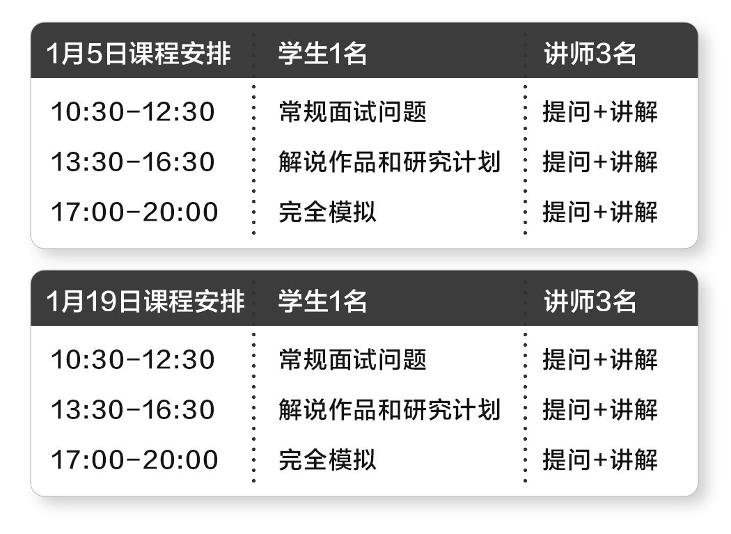 这次的模拟面试课程采用一天刷三轮的形式,分为1月5号和1月9号两期进行,也就是每位学员可以刷六轮面试。并且在候场室可以通过直播看到其他同学的面试过程和老师点评,起到互相学习的作用。
