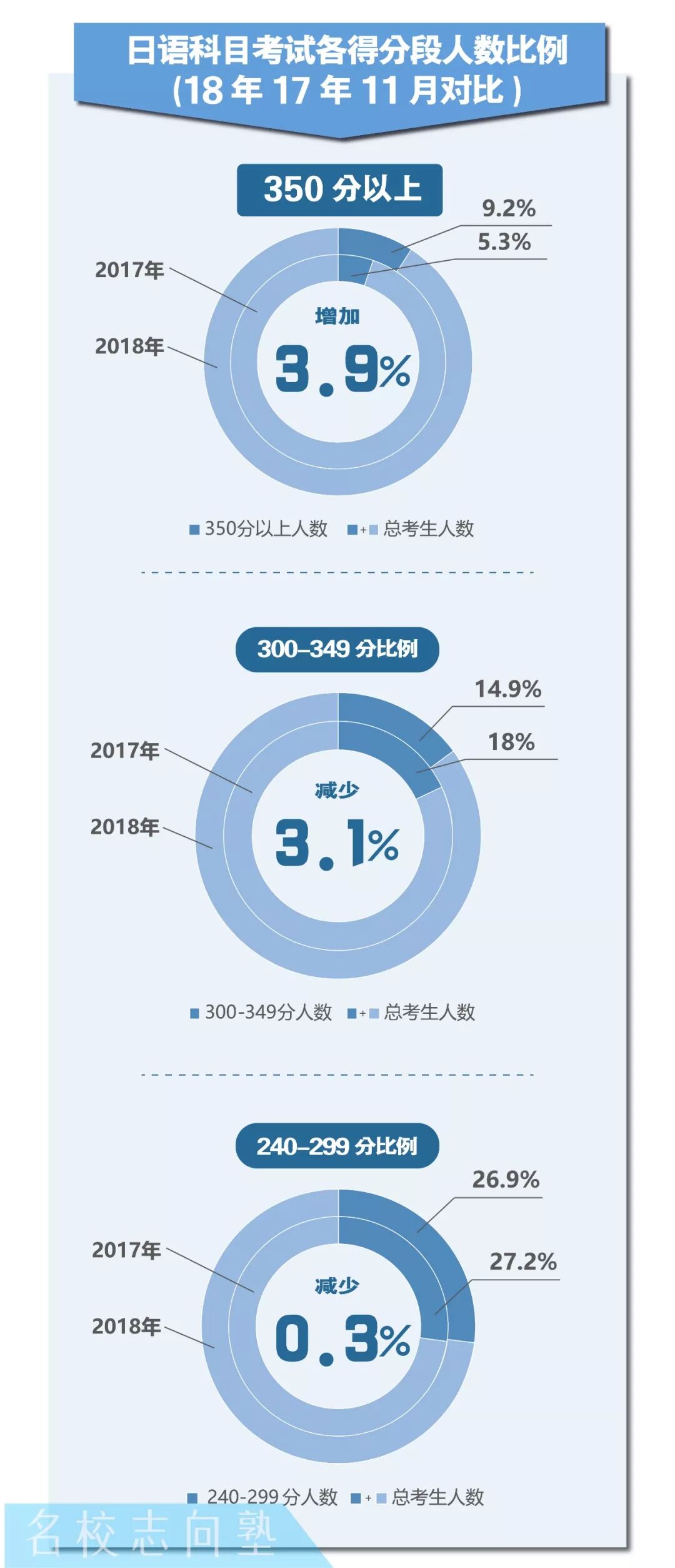 从人数上看,240分段以上的人数整体上并没有太大变化,但事实上,考虑到参加留考人数的增长,从上图的统计中我们可以很害怕地看到,日语350+的人数相比去年大概增加了一倍。