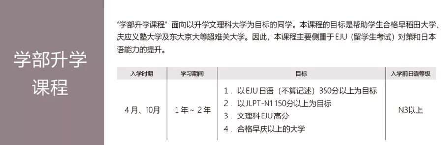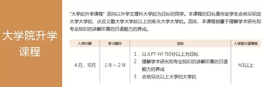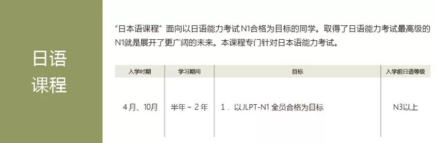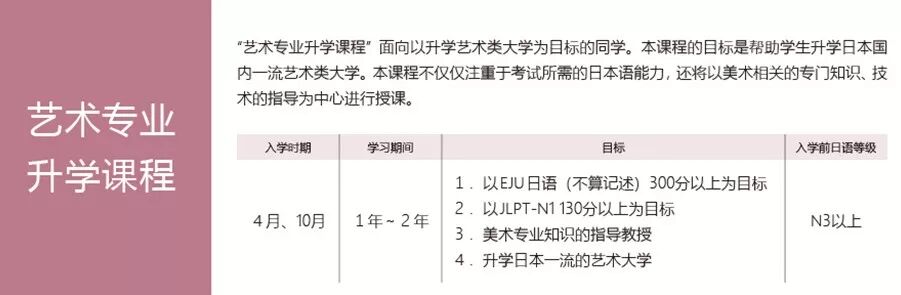 随着每年来日留学生数量的增长,要求留学生所具备能力也随之提高。为了应对更加激烈的升学竞争,名校教育日本语学校采取塾与语言学校一体化模式,将升学所必需的综合性技巧和日语能力、专业知识的学习作为重点,根据考学需求划分“学部升学课程”“大学院升学课程”“美术专业升学课程”“日语课程”四类。