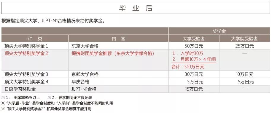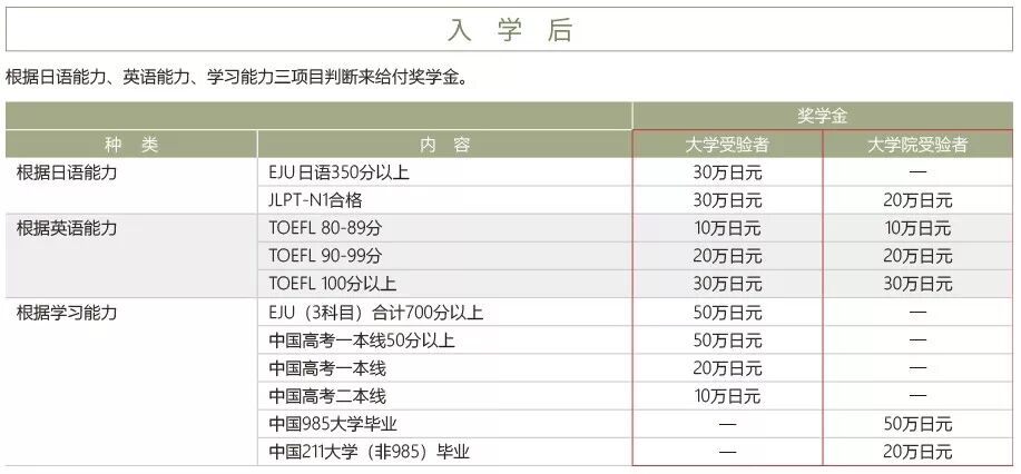 满足不了全部条件的,根据日语英语能力与学习能力,我们还设立了单项奖学金。截止到毕业,根据取得的资格和日语水平的提高,申请者最高有可能获得510万日元的奖学金。