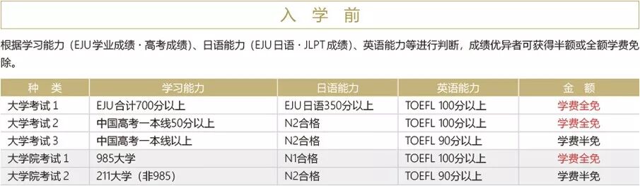 入学前我们根据学习能力(EJU成绩、高考成绩)、日语能力(EJU、JLPT成绩)及英语能力(托福成绩)设定标准,满足全部标准的同学可以获得相当于自己所报课程全年或者半年学费的奖学金