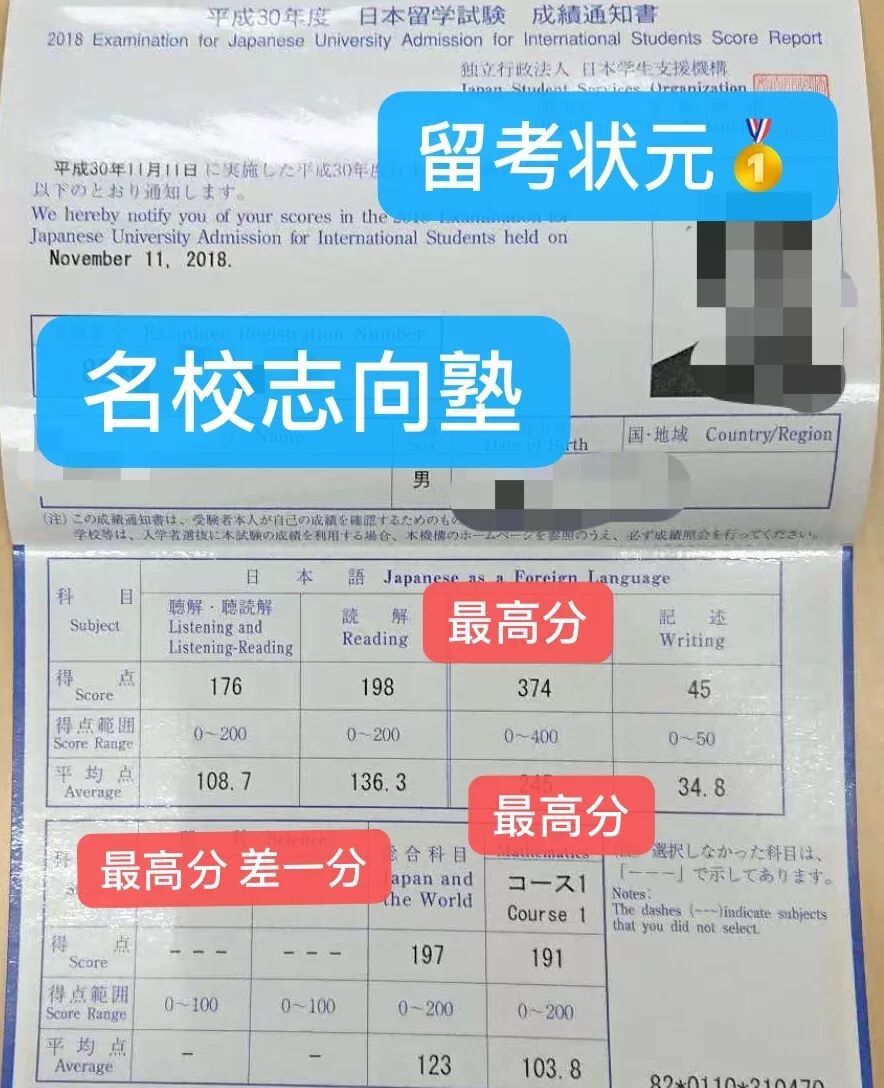 不仅如此,名校志向塾学员还取得了2018年冬季文科留考总分日本第一的傲人成绩!