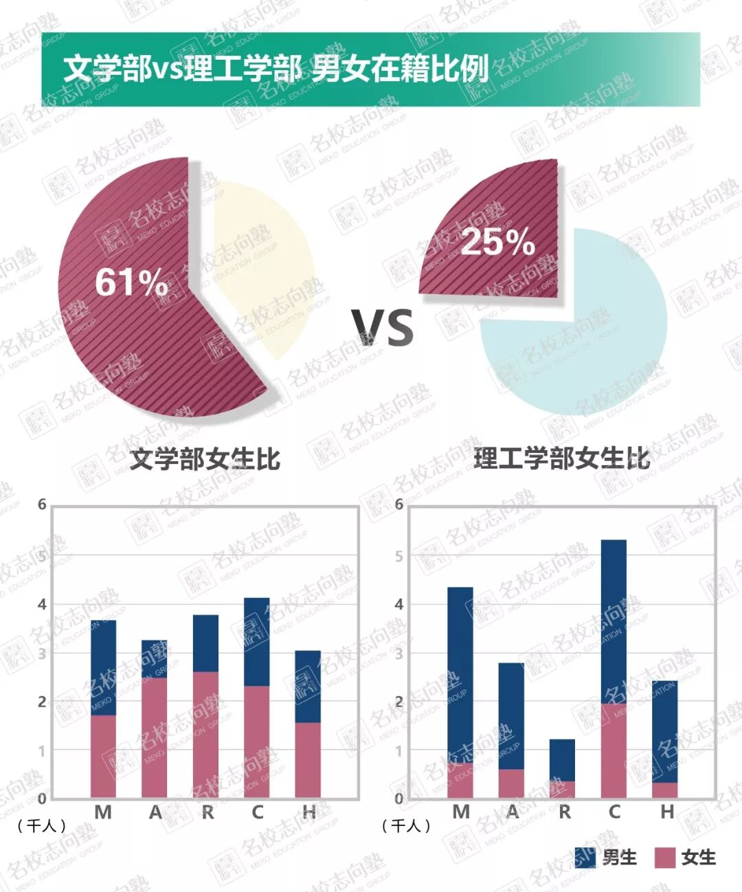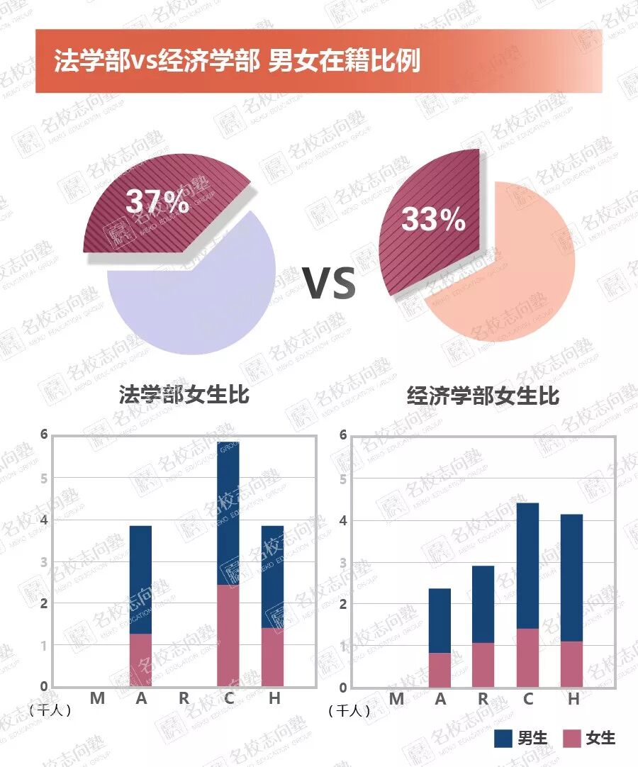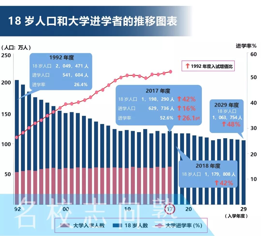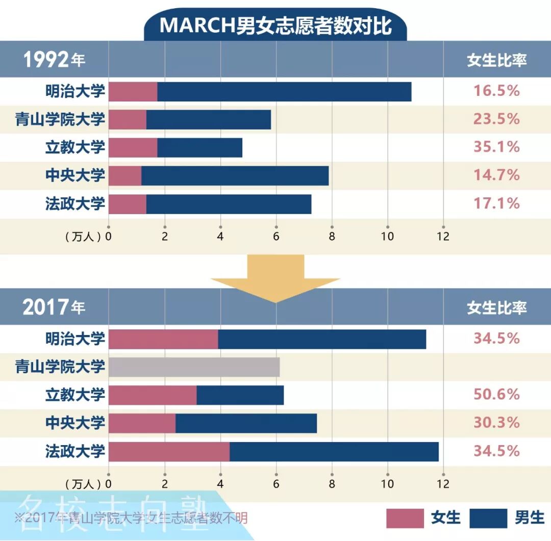 1 背景 少子化现象持续不止,大约四成的日本私立大学招不满定员,从而深陷经营赤字危机。在这样的背景下,女生逐渐成为各方瞩目的焦点。各个大学都在拼尽全力吸引女学生报考自己的学校。MARCH在这场女子争夺战中又表现如何呢? 日本18岁人口(正常情况下大学入学时的年龄)的数量,在1992年达到巅峰的204.9万人之后,就在不停的减少。2018年掉落回了118.0万人。根据此前的预测,2030年将会减少到106.4万人。 在这段期间,大学进学率由原本24.6%一口气增长到了52.6%。尤其女生方面,大学进学率从原先的14%未满一口气增长到了49.1%。 与此同时,1990年的时候大学数量还只有507所(其中私立学校478所)。2017年的时候,大学的数量激增到了780所(其中私立大学604所)。相对应的,大学在籍人数也从200万人左右增加到了289万人。 可惜这样的黄金时期终有落幕之时。目前,由于少子化现象的不断加剧,加上年轻人普遍倾慕前往大城市读书的原因。大约4成的地方中小私立大学因为招不够学生,深陷经营赤字问题。相信在不久的将来,会有更多大学陷入经营危机。 2 变化 1992年,女生报名比例最高的立教大学也没有达到2万报名人次。25年过去了,MARCH院校的女生报名比例又发生了哪些变化呢?立教是否还是第一,明治中央还是垫底? 1992年,MARCH中没有一所学校女生报考人数超过2万人次,最惨淡的中央大学女生报考人数仅有1万人次左右。然而,仅仅只过去了25年,报考MARCH的女生人数有了一个大幅度的增长。报考立教大学的考生中女生比例超过5成,法政大学和明治大学的女生报考人数都达到了4万人左右。就连女生报考比例最低的中央大学也突破了2万人次。 3 对比 众所周知,不同专业间的男女比例差别很大。让我们来对比一下MARCH几个专业之间的男女生比例,看看哪所学校的哪个专业更加青睐女生。 由于各所学校对于经营专业和商学专业的定义不同,导致了商学和经营专业数据信赖度不高。所以我们在这边只挑选了文学,理工,法学和经济学四个专业进行对比。 文学专业的整体女生比例最高,10个男生中有6位是女生。单纯数字来看这个女生比例已经很高了,但是日本院校文学专业的女生平均比例是70%。除了青山学院大学和立教大学的文学女生占比超过7成以外,其它三所院校严重不达标!! 理工专业的女生人数比例不出意料,在四个专业中比例最低,平均女生比只有25%。但是,其中中央大学的数据值得推敲一番。中央大学理工专业女生比例竟然超过了33%,在理工专业来说是一个非常令人惊叹的数据。经过我们的一番调查,我们了解到不同于大部分院校,中央大学为女生提供了非常完善的研究环境(教职课程/都心校区/支援项目/就业体验)。如果你是一名以理工科为目标的女生,中央大学或许是个不错的选择! 社会科学学科方面女生占比一般是35%「学校基本调查2017」,MARCH也基本遵循这个倾向,并没有特别意外的结果。 注:法学和经济专业属于社会科学 4 排名 我们统计了MARCH院校中女生比例高于50%的所有专业,并从高到低进行了排序。 提到女生比例高的专业,我们最先会联想到文学,教育,看护专业等。然而,随着时间的变迁,女生们的青睐对象也发生了些许的变化。虽然文学,福祉等专业女生比例依旧不少。但是,除了中央大学以外,其余三所院校女生比例最高的专业都是国际系相关专业。 5 总结 目前来看,MARCH院校在这场女子大争夺战中取得了骄人的成绩。无论哪一所院校,相较于1992年,女生的报考人数以及专业女生比例都有一个极大的增长。 法政,明治的报考女生数量最多;立教,青山学院大学的在籍和报考女生比例最高。 女子争夺战才刚刚拉开序幕,之后如何就让我们用双眼一起见证吧! 注:2017年青山学院大学的在籍女生比例高达49.9%,MARCH院校中仅低于立教。 文中数据来源于网络。 (名校志向塾:kino) 三月考学日历下载: