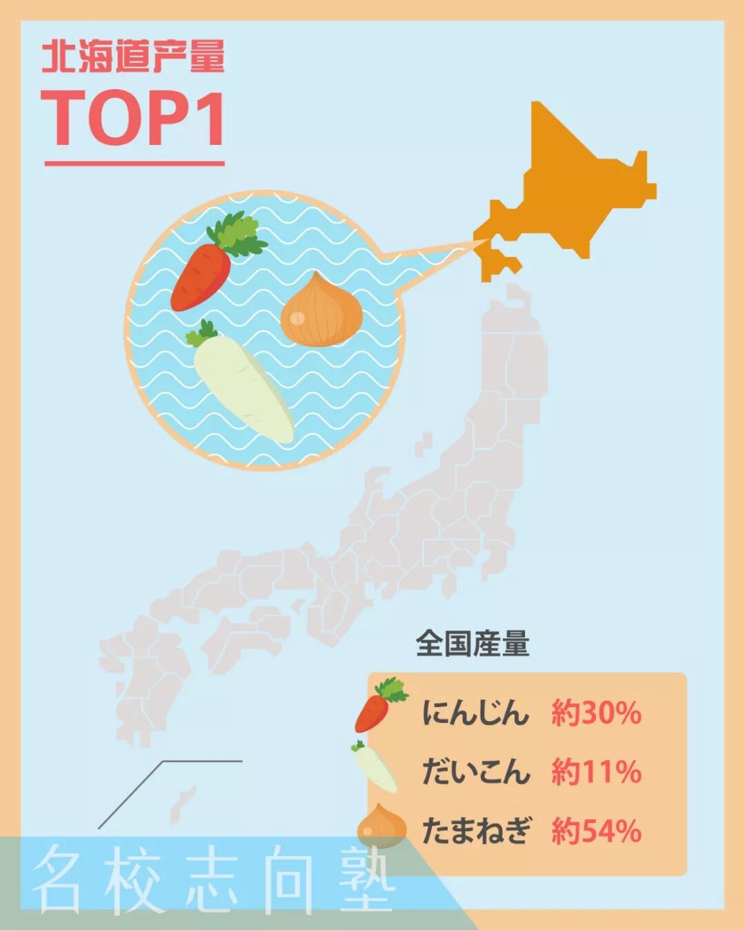 北海道是日本蔬菜产出总额排行榜上雷打不动的榜首,其中胡萝卜,白萝卜,洋葱的产量位居日本第一。