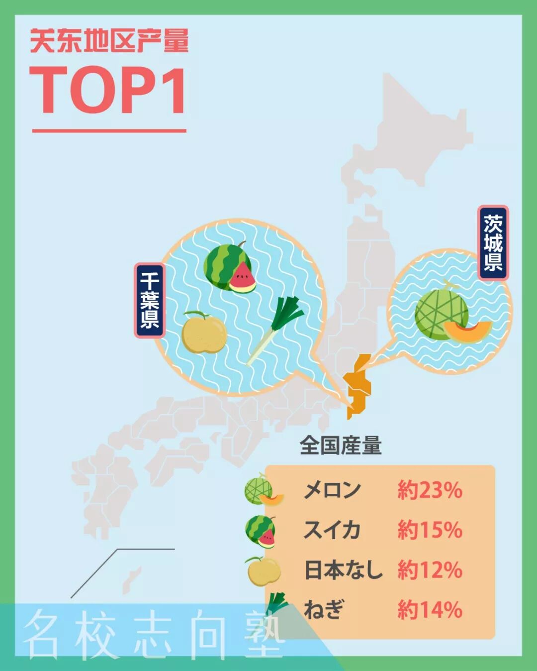 关东地区--逐渐贵族化的果蔬们 茨城:哈密瓜(占全国产值23%), 青椒(占全国产值22%),茄子,卷心菜,白菜,米 千叶:西瓜(占全国产值15%), 菠菜(占全国产值12%),葱(占全国产值14%), 日本梨(占全国产值12%)卷心菜 群马:黄瓜(占全国产值10%),卷心菜,生菜,白菜 埼玉:黄瓜,葱 枥木:草莓(占全国产值16%) 神奈川:卷心菜,萝卜 东京:花卉