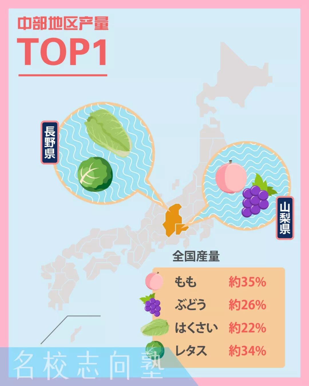 中部地区--○○狩りしよう! 新潟:大米(占全国总产值8.3%) 山梨:桃子(占全国总产值35%) 葡萄(占全国总产值26%) 长野:生菜(占全国总产值34%) 白菜(占全国总产值22%) 静冈:草莓 爱知:卷心菜(占全国总产值18%),白菜,草莓,哈密瓜 富山:米 石川:温室哈密瓜 福井:温室哈密瓜 岐阜:菠菜,柿子,栗子