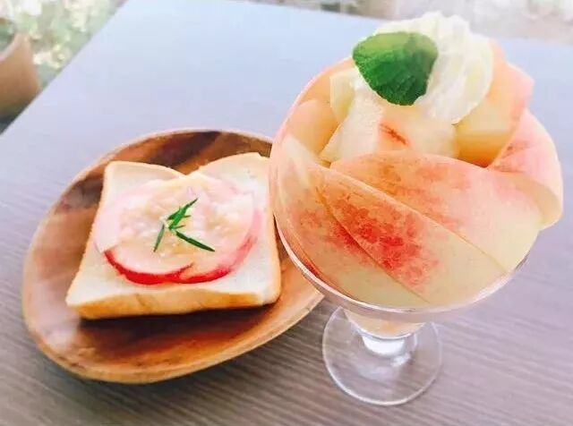 在传统的采摘活动之外,山梨县供游客小憩的桃子咖啡也颇负盛名,尤其是招牌的桃子芭菲深受女性欢迎。