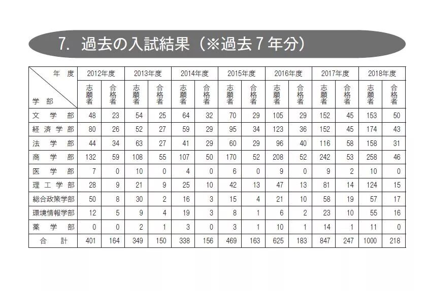 非常重要的参考。有些大学会在要项的最后附上前几年的入试结果,同学们可以通过这类的表单了解到该大学的竞争激烈程度。也可以通过报名人数的走向判断出人气学部。