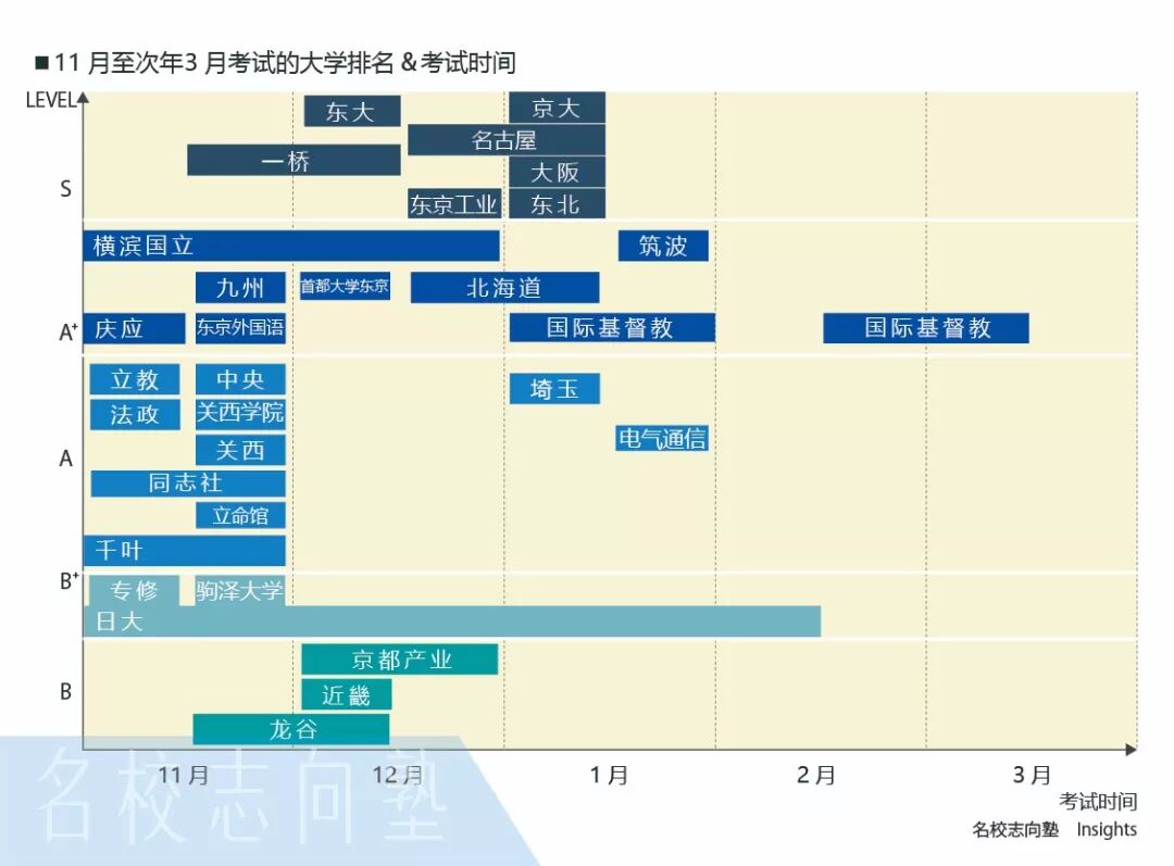 *由于日本大学、横滨国立大学各个学部出愿时间不统一,上图中关于以上两个学校的出愿期间的计算是以“最早开始出愿的学部-最晚截止的学部”时间为基准