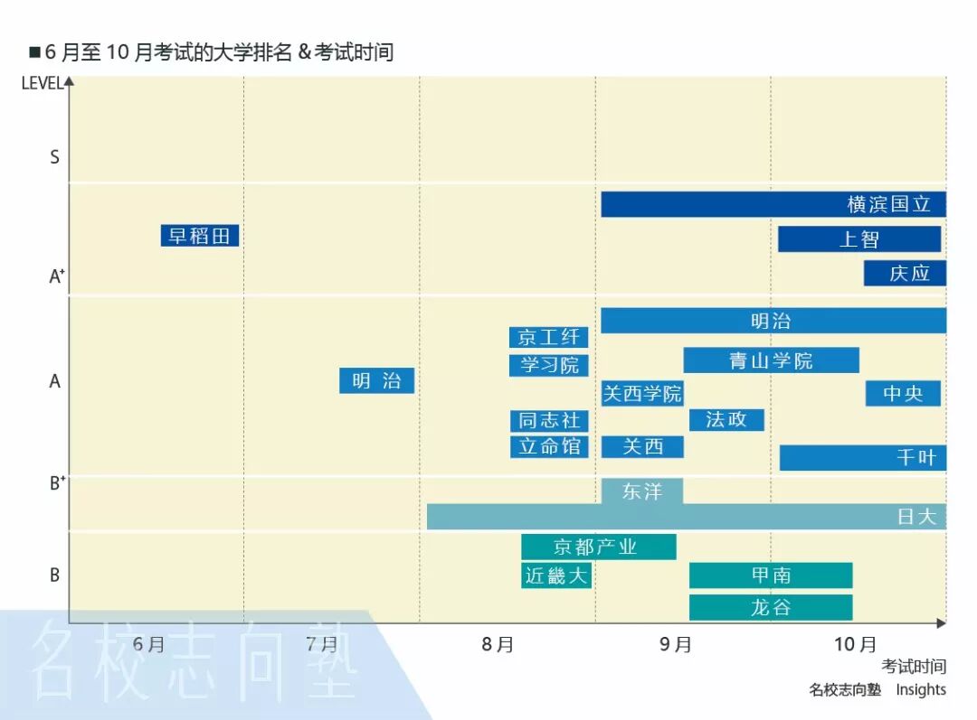 从上图可以看出,早大是全日本所有大学中出愿时间最早的,早在6月就开始报名了,时间点恰好在留考结束后。