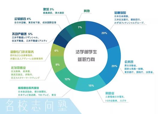 选择直接就职的,按就业人数多到少排列,金融保险业与公务员各占约20%,占了法学部生就职的半壁江山。然后是制造业,占比15%;情报通信服务与媒体,占比12%;批发与零售业,占比8%;调查与专门技术服务,占比6%;不动产相关,占比5%;最后是运输邮政与建筑业,各占比4%与3%。(上图