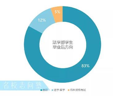 我们先来看法学部生毕业后的进路。如上图,法学部学生毕业后,选择报考大学院或者海外留学的学生占12%;5%的学生选择挑战公务员考试,司法考试,公认会计师考试这样的资格考试;剩下的绝大部分(83%)选择就职