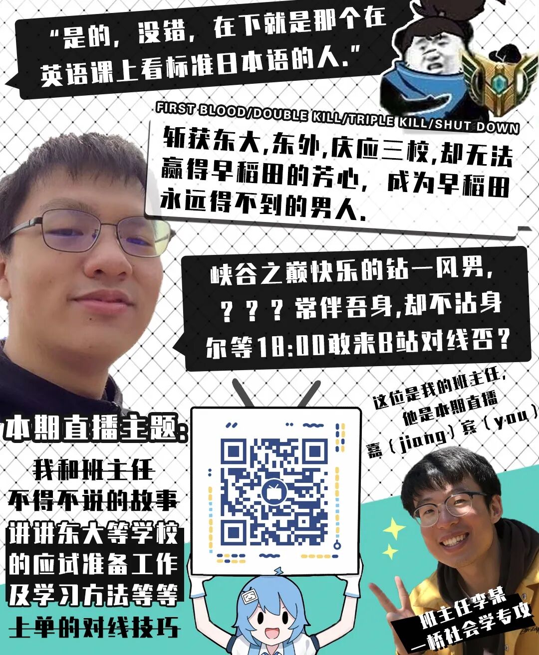 关于考学更多的心路历程,明日东京时间18:00,卢同学将在名校志向塾网络直播平台上进一步分享!b站将同步直播!敬请扫码提前马克!